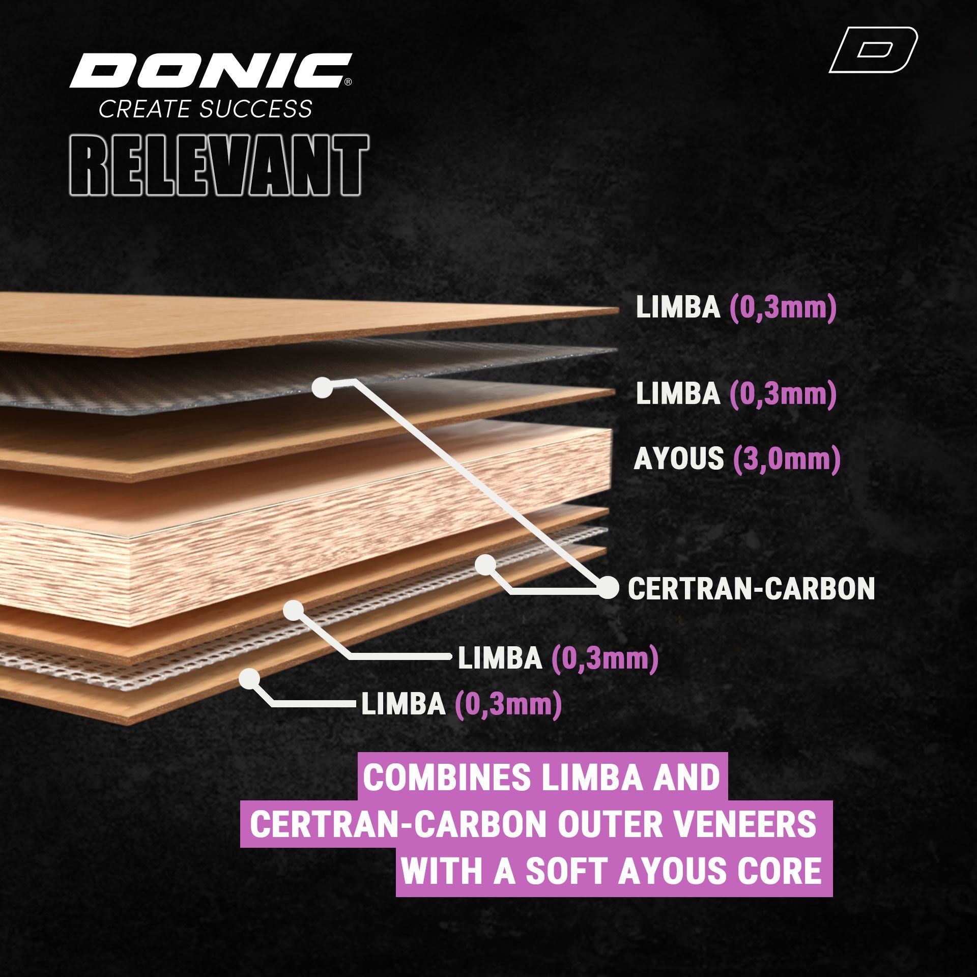 A completely new blade from China, the land of World Champions. The excellent dynamics of the DONIC RELEVANT are due to the use of Certran, a synthetic fibre used to produce winch launching cables for seaplanes and fishing lines, amongst other things. This material is 15 times stronger than steel in terms of tensile strength. Despite this high level of strength, the finely balanced RELEVANT provides pleasant, non-disruptive vibrations and very good ball feedback. A moderately offensive blade at a moderate price.